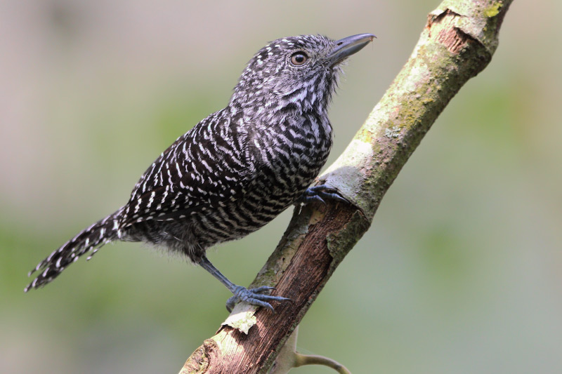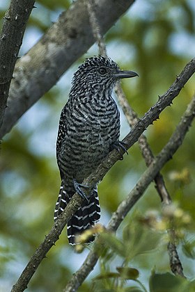 | Un pájaro tímido típicamente encontrado en matorrales y bordes de bosque. Al igual que otros batarás, tiene pico robusto con punta ganchuda. El macho tiene todo el cuerpo barrado en blanco y negro, muy similar a Barred Antshrike pero con la corona barrada (no sólidamente oscura). La hembra tiene la gorra y las partes superiores rojizas y es completamente barrada en blanco y negro abajo. Muy a menudo visto en parejas moviéndose sigilosamente a través de la vegetación densa; puede ser difícil obtener una vista clara. Restringido al oeste de Colombia. Escucha por su canto en aceleración, similar a Barred Antshrike pero con un final menos explosivo. |